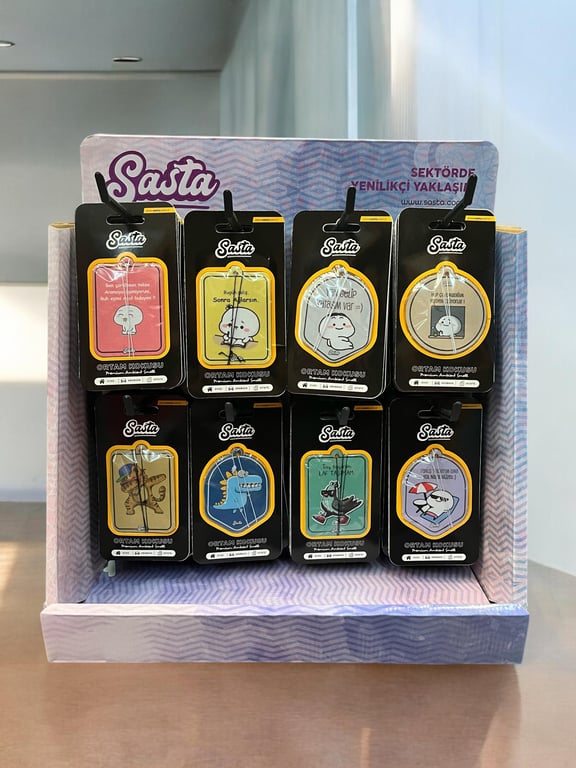 Her biri farklı baskılarla süslenmiş (doğa, bayrak, yazılı tasarımlar, figürler vs.) bu kokular; özellikle dikkat çekici ambalajları ve çeşitliliği ile satış noktalarında müşterilerin ilgisini çeker. Limon, lavanta, okyanus gibi çok tercih edilen aromalarla donatılmış olan bu ürünler; benzinlik, oto aksesuar, bijuteri, market ve kırtasiyelerde satışa uygundur.