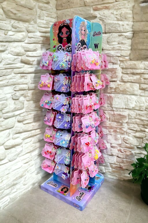 Renkli ve gösterişli tasarımlarıyla kız çocukları ve gençlere hitap eden bu set, bijuteri, market, kozmetik mağazası, oyuncakçı ve kırtasiyeler için sergilemeye hazır şekilde gelir. Toplam 280 adetlik bu avantajlı paket, hem görsel olarak zengin hem de ekonomik bir toptan satış çözümüdür.
