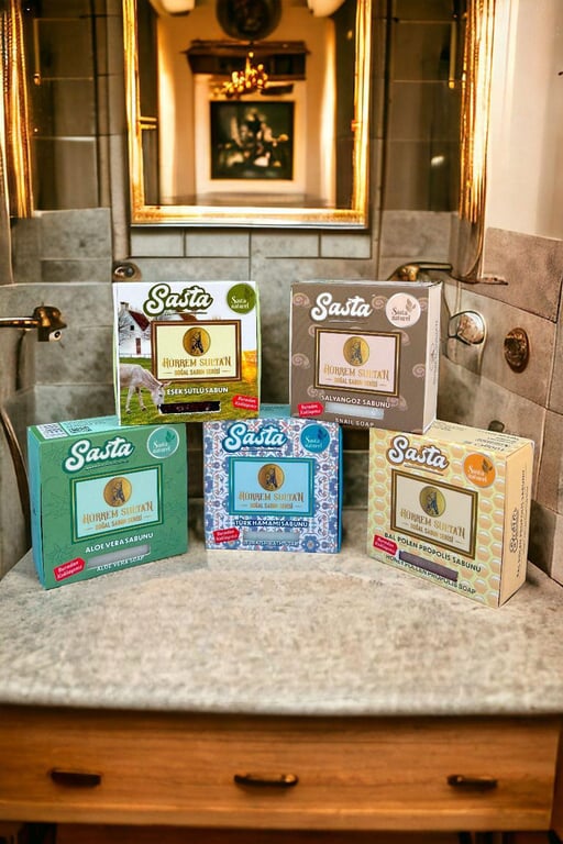 SASTA Doğal içerikli Hürrem Serisi sabunlar, 100 gramlık özel kalıplarda sunulur. 50 adetlik toptan paket, hem satış hem hediye amaçlı idealdir