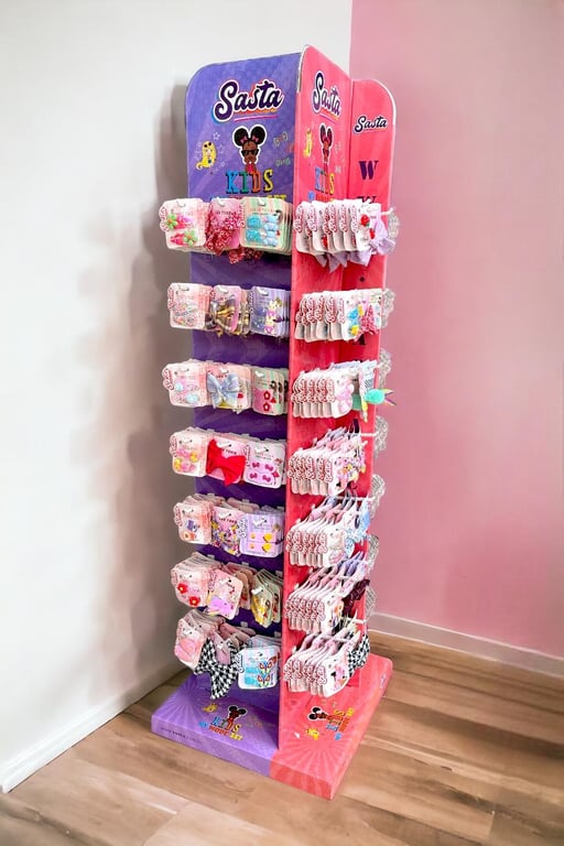 660 parçalık bu kapsamlı toka standı, bijuteri, market, kırtasiye ve aksesuar mağazaları için yüksek satış potansiyeli sunar. Ürünler, dikkat çekici ve düzenli stand ambalajı içinde sunulur. Pratik kullanım sağlayan tokalar; saçta sağlam tutuş sağlar, kırma veya kayma yapmaz.