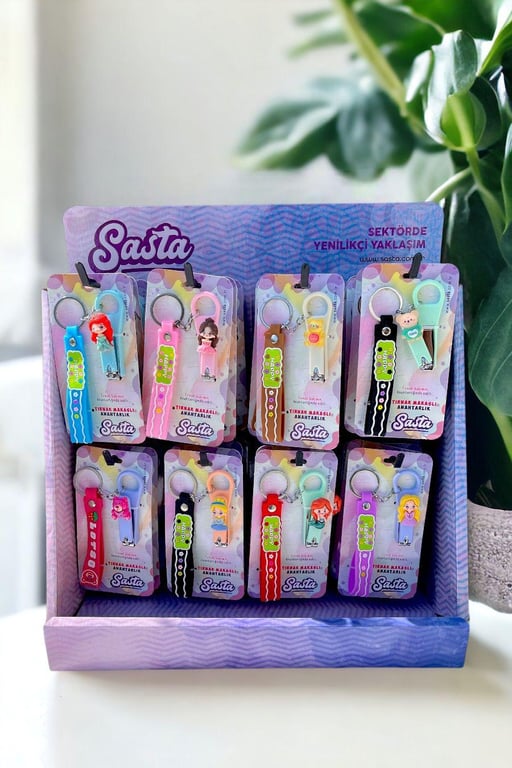 Tırnak makası ve anahtarlık fonksiyonunu bir araya getiren pratik ürün, 40 adetlik stand ambalajıyla satışa hazırdır. Hem işlevsel hem dekoratif!
