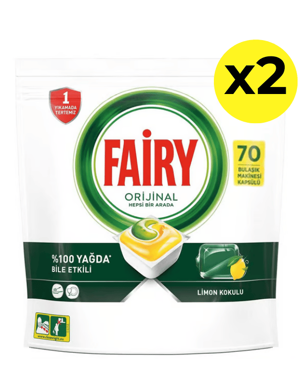Ürün 70x2 olarak gönderilmektedir. Fairy Hepsi Bir Arada Limon Kokulu Bulaşık Makinesi Tableti bulaşıklarınızı çizmeden pırıl pırıl yapar, konsantre formülü bulaşıklarınıza ışıltılı bir temizlik vermek için yağı anında çözer.