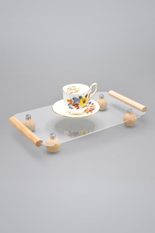 Ahşap Top Ayaklı Pleksi Şeffaf Dekoratif Tepsi, Düzenleyici,Sunumluk