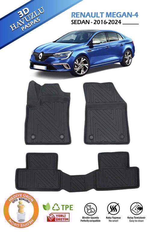 Havuzlu 3d Siyah Paspas Takımı, Renault-Megan4-Sedan-1  2016-2024 Arası, 3d Havuzlu Paspas, HediyeAraç Kokusu;