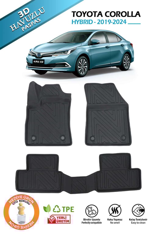Toyota Corolla Hybrid 2019-2024 modelleri için özel olarak üretilen bu paspas seti, arabanın zeminine tam oturacak şekilde şekillendirilmiştir.;