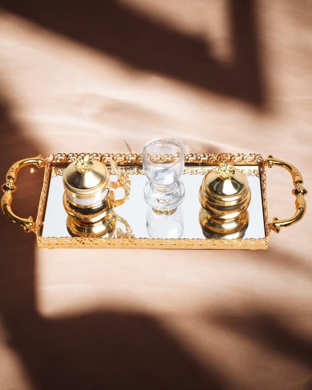 Özel tasarımıyla zarafeti ve şıklığı bir arada sunan, altın dantel detaylarıyla bezeli kahve tepsisi, söz ve nişan organizasyonlarınızda fark yaratacak.