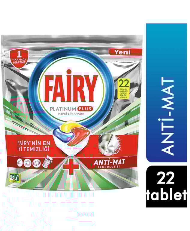Yeni gibi tertemiz bulaşıklar için, Fairy Platinum Plus’ı deneyin. Fairy'ın en inatçı yemek kirlerini temizleme özelliği bulaşıklarınızı yeni gibi tertemiz yapar. Fairy Platinum Plus bulaşık makinesi kapsülleri sadece inatçı yemek kalıntılarını parçalamakla kalmaz, aynı zamanda, zamanla oluşan matlığı da gidermenize yardımcı olur ve böylece bulaşıklarınıza gerçek parlaklığını geri kazandırır. Hepsi bir arada etkiye sahip Fairy Platinum Plus bulaşık makinesi kapsülleri düşük sıcaklıklarda bile hızlı çözünür. Kısa programlı yıkamada kullanılabilir ve hepsi bir arada durulama yardımı ve tuz fonksiyonu, gümüş ve cam koruma ile birlikte sunulur. Matlaşma giderici özel formülüyle bulaşıklarınıza eski parlaklıklarını geri kazandıran Fairy Platinum Plus Bulaşık Makinesi Kapsülü, çok yönlü etkiye sahip güçlü formülüyle en zorlu lekeleri tek yıkamada çıkarır ve bulaşıklarınızda kusursuz hijyen sağlar, kalıntı ve iz bırakmadan temizler.
