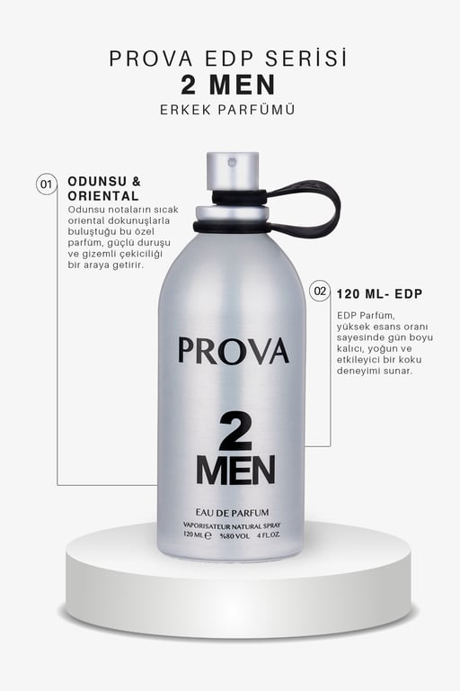 Prova 2 Men EDP Erkek Parfümü, unutulmaz bir koku deneyimi sunan bir seçenektir; Kalıcı ve etkileyici kokusuyla çevrenizdekileri büyüler; Tepe notalarında yeşil çay, bergamot ve greyfurt bulunur; Bu notalar, parfüme taze ve canlı bir başlangıç sağlar, enerji verir; Orta notalarda lavanta, menekşe ve petitgrain bulunur; Bu notalar, parfüme sofistike bir dokunuş katar, ferahlatıcı ve rahatlatıcı bir etki sağlar; Baz notalarda sandal ağacı, güve otu ve misk bulunur; Bu notalar, parfüme derinlik ve kalıcılık kazandırır, aynı zamanda sıcak ve cazibeli bir his verir; Prova 2 Men, unutulmaz bir imza kokusu arayan erkekler için idealdir; Odunsu ve ferahlatıcı karakteriyle özgün bir tarz sergiler; Gün boyu kalıcılığıyla sizi eşsiz kılar ve çevrenizdekilerin dikkatini çeker; Hem günlük kullanıma uygun hem de özel günlerde tercih edilebilir; Bu şık metal şişe, kendi kokunuzu keşfetmenizi sağlar ve tüm cilt tipleri için uygun bir seçenektir; Temiz tene ve kıyafete istenilen sıklıkta uygulanabilir; Duştan sonra kullanıldığında daha fazla kalıcılık sağlar; Günlük kullanıma uygun olan bu parfüm, bilek, dirsek içi, kulak arkası, boyun gibi sıcak noktalara uygulanabilir; Uygulama sırasında göze veya tahriş olmuş deriye temas etmemeye özen gösterilmelidir; Yaklaşık 15; 20 cm uzaktan püskürtülerek kullanılmalıdır; Bu parfüm, size şıklık ve etkileyici bir koku deneyimi sunmak için tasarlandı; Kendinizi güzelliğin ve şıklığın içinde hissetmek için bu parfümü tercih edebilirsiniz; Deneyimleyeceğiniz her an, kokunun kalıcılığıyla baş döndürücü bir etki yaratıyor; Kalıcılığıyla öne çıkan bu parfüm seti, size unutulmaz bir deneyim sunuyor; Her sıkışınızda, kokunun büyüsüyle çevrenizde iz bırakmaya devam edeceksiniz; EDP parfümler, en yüksek esans yoğunluğuna sahip olan kokulardır; Bu güçlü ve etkileyici parfümler, kısa sürede büyüleyici bir etki yaratır;