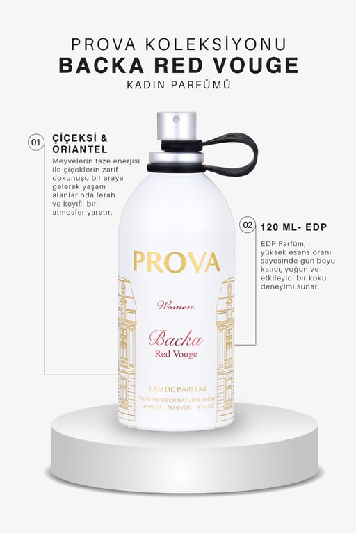 Bıraktığı iz kalıcı, etkisi unutulmaz; kadının gücünü ve zarafetini simgeleyen kalıcı bir parfüm.; Prova backa red vouge edp kadın parfüm, iddialı ve etkileyici kadınlar için özel olarak tasarlanmış bir kokudur.; Aromatik ve çiçeksi özlerin birleşimiyle büyüleyici bir etki yaratır.; Tepe notasında tagette, safran ve portakal gibi notalar bulunur.; Bu notalar, kokuya enerji ve canlılık katarak etkileyici bir açılış sağlar.; Orta notasında portakal çiçeği, yasemin ve karamel bulunur.; Bu notalar, çiçeksi ve tatlı bir dokunuş sunarak parfümün karakterini belirler.; Dip notasında yosun, misk ve amber bulunur.; Bu notalar, derinlik ve kalıcılık katarken, kokuya biraz daha gizemli ve baştan çıkarıcı bir his verir.; Prova backa red vouge, kendine güvenen ve iddialı kadınların kişiliğini tamamlayan bir parfümdür.; Büyüleyici ve etkileyici kokusuyla çevrenizde iz bırakmanızı sağlar.; Bu şık cam şişe, kendi kokunuzu keşfetmenizi sağlar ve tüm cilt tipleri için uygun bir seçenektir.; Temiz tene ve kıyafete istenilen sıklıkta uygulanabilir.; Duştan sonra kullanıldığında daha fazla kalıcılık sağlar.; Günlük kullanıma uygun olan bu parfüm, bilek, dirsek içi, kulak arkası, boyun gibi sıcak noktalara uygulanabilir.; Uygulama sırasında göze veya tahriş olmuş deriye temas etmemeye özen gösterilmelidir.; Yaklaşık 15 - 20 cm uzaktan püskürtülerek kullanılmalıdır.; Bu parfüm, size şıklık ve etkileyici bir koku deneyimi sunmak için tasarlandı.; Kendinizi güzelliğin ve şıklığın içinde hissetmek için bu parfümü tercih edebilirsiniz.; Deneyimleyeceğiniz her an, kokunun kalıcılığıyla baş döndürücü bir etki yaratıyor.; Kalıcılığıyla öne çıkan bu parfüm seti, size unutulmaz bir deneyim sunuyor.; Her sıkışınızda, kokunun büyüsüyle çevrenizde iz bırakmaya devam edeceksiniz.; Edp parfümler, en yüksek esans yoğunluğuna sahip olan kokulardır.; Bu güçlü ve etkileyici parfümler, kısa sürede büyüleyici bir etki yaratır.