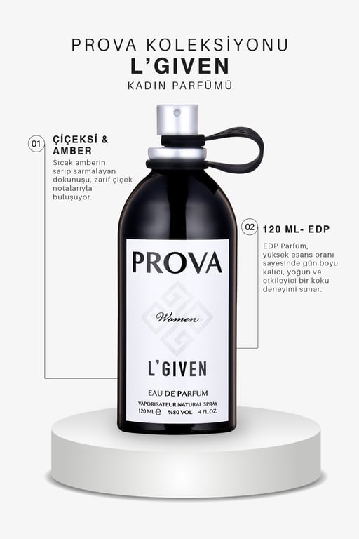Bıraktığı iz kalıcı, etkisi unutulmaz ; Kadının gücünü ve zarafetini simgeleyen kalıcı bir parfüm.; Prova L' Given EDP Kadın Parfümü 120 ml, etkileyici bileşenleriyle size kendinizi özel hissettirecek bir koku seçeneğidir.; Bu parfüm, bergamot, karamel ve amberin eşsiz karışımıyla gün boyu iddialı bir duruş sergilemenizi sağlar.; ; Tepe notalarında bergamot, armut ve pembe biber gibi ferah ve enerjik kokular bulunur.; ; Orta notalarda karamel, kaşmir ve yasemin gibi tatlı ve zarif notalar yer alır.; ; Dip notalarda amber, misk ve paçuli gibi derin ve kalıcı notalar bulunur.; Bu notalar, parfüme derinlik ve kalıcılık sağlar.; Amberin sıcaklığı, miskin yumuşaklığı ve paçulinin odunsu kokusu, parfümün etkileyici bir iz bırakmasını sağlar.; Prova L' Given EDP Kadın Parfümü, etkileyici bileşenleriyle size kendinizi özel hissettirir ve gün boyu iddialı bir duruş sergilemenizi sağlar.; Bu koku, özgün ve çekici bir karakter yaratmanıza yardımcı olur.; Bu şık metal şişe, kendi kokunuzu keşfetmenizi sağlar ve tüm cilt tipleri için uygun bir seçenektir.; Temiz tene ve kıyafete istenilen sıklıkta uygulanabilir.; Günlük kullanıma uygun olan bu parfüm, bilek, dirsek içi, kulak arkası, boyun gibi sıcak noktalara uygulanabilir.; Uygulama sırasında göze veya tahriş olmuş deriye temas etmemeye özen gösterilmelidir.; Yaklaşık 15 - 20 cm uzaktan püskürtülerek kullanılmalıdır.; Bu parfüm, size şıklık ve etkileyici bir koku deneyimi sunmak için tasarlandı.; Kendinizi güzelliğin ve şıklığın içinde hissetmek için bu parfümü tercih edebilirsiniz.; Deneyimleyeceğiniz her an, kokunun kalıcılığıyla baş döndürücü bir etki yaratıyor.; Kalıcılığıyla öne çıkan bu parfüm seti, size unutulmaz bir deneyim sunuyor.; Her sıkışınızda, kokunun büyüsüyle çevrenizde iz bırakmaya devam edeceksiniz.; EDP parfümler, en yüksek esans yoğunluğuna sahip olan kokulardır.; Bu güçlü ve etkileyici parfümler, kısa sürede büyüleyici bir etki yaratır.; ;