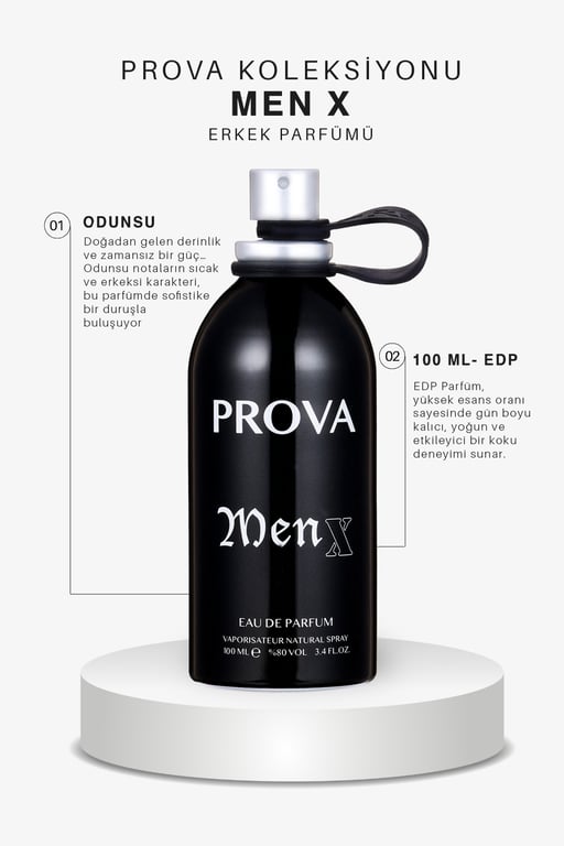 Prova Men X EDP Erkek Parfümü, hareketli, canlı ve dışadönük erkeklerin vazgeçilmez kokusu olarak öne çıkar; Enerjik bir etki yaratır ve en hareketli günlerde tercih edebileceğiniz bir seçenektir; Tepe notalarında limon ve adaçayı bulunur; Bu notalar parfüme ferahlık ve canlılık katar, enerjik bir başlangıç sağlar; Orta notalarda tarçın, kakule ve balzamik bulunur; Bu notalar parfüme baharatlı ve odunsu bir karakter kazandırır, aynı zamanda sıcak ve çekici bir etki yaratır; Baz notalarda gül ağacı, patchouli ve amber yağı bulunur; Bu notalar parfüme derinlik ve kalıcılık sağlar, aynı zamanda maskülen ve çekici bir his uyandırır; Prova Men X, aktif ve dinamik erkeklerin tarzına uygun bir seçenektir; Hareketli günlerde enerjinizi yansıtmanızı sağlar; Günlük kullanıma uygun olmasının yanı sıra özel etkinliklerde veya gece davetlerinde de tercih edebilirsiniz; Prova Men X, kendinizi özgür ve enerjik hissetmek istediğiniz anlarda ilk tercihiniz olabilir; Bu şık metal şişe, kendi kokunuzu keşfetmenizi sağlar ve tüm cilt tipleri için uygun bir seçenektir; Temiz tene ve kıyafete istenilen sıklıkta uygulanabilir; Duştan sonra kullanıldığında daha fazla kalıcılık sağlar; Günlük kullanıma uygun olan bu parfüm, bilek, dirsek içi, kulak arkası, boyun gibi sıcak noktalara uygulanabilir; Uygulama sırasında göze veya tahriş olmuş deriye temas etmemeye özen gösterilmelidir; Yaklaşık 15; 20 cm uzaktan püskürtülerek kullanılmalıdır; Bu parfüm, size şıklık ve etkileyici bir koku deneyimi sunmak için tasarlandı; Kendinizi güzelliğin ve şıklığın içinde hissetmek için bu parfümü tercih edebilirsiniz; Deneyimleyeceğiniz her an, kokunun kalıcılığıyla baş döndürücü bir etki yaratıyor; Kalıcılığıyla öne çıkan bu parfüm seti, size unutulmaz bir deneyim sunuyor; Her sıkışınızda, kokunun büyüsüyle çevrenizde iz bırakmaya devam edeceksiniz; EDP parfümler, en yüksek esans yoğunluğuna sahip olan kokulardır; Bu güçlü ve etkileyici parfümler, kısa sürede büyüleyici bir etki yaratır;
