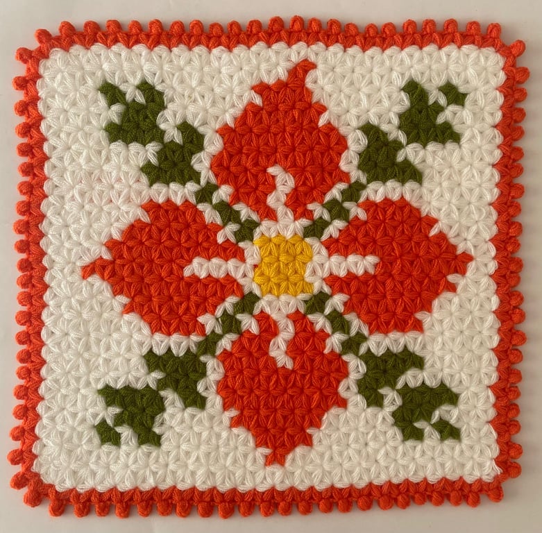 HERŞEY FIRSAT Banyo Lifi Yün El Örmesi Ceyizlik Kare  Çiçek Desenli-Turuncu