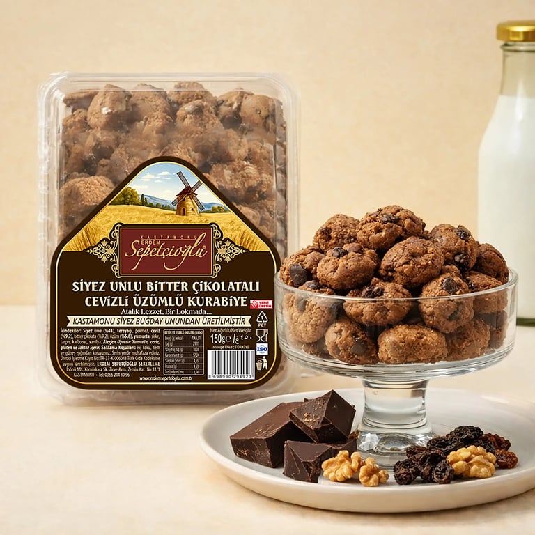 Kastamonu siyez buğdayından elde edilen un; kurabiyeye kendine özgü yoğun aroma ve tok bir yapı kazandırır. Bitter çikolatanın dengeli kakao notası, ceviz içinin doğal aroması ve üzümün hafif tatlı dokunuşu ile bir araya gelerek katmanlı bir lezzet deneyimi sunar. Sepetçioğlu markasıyla sunulan bu özel siyez kurabiye, çay ve kahve yanında ideal bir eşlikçidir.