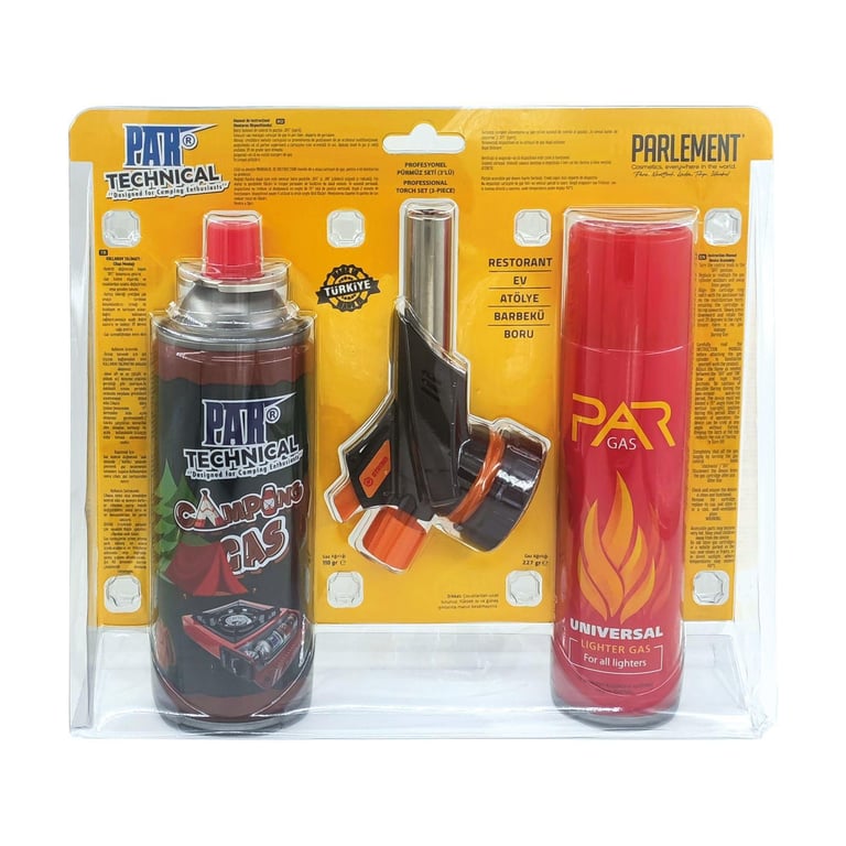 Parlement Profesyonel Pürmüz Seti, 227 gr pürmüz gazı ve 200 ml çakmak gazı ile birlikte gelir. Mutfak, kamp, hobi ve tamir işlerinizde güvenli ve pratik kullanım sunar.