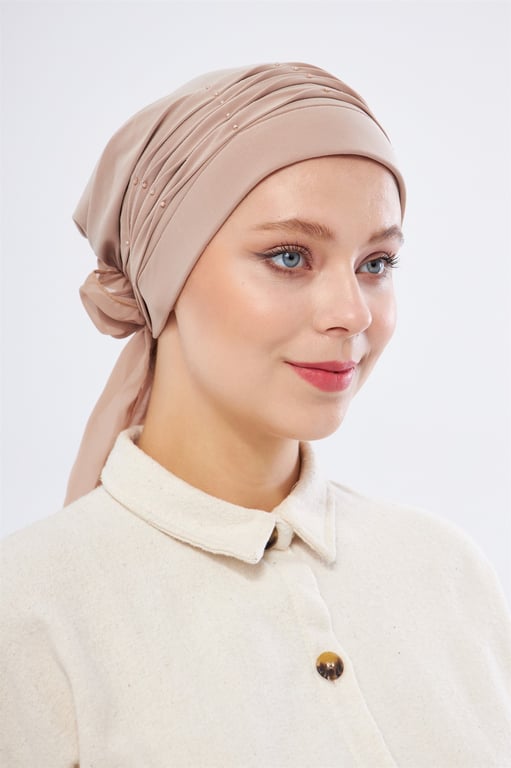 Hürrem Bone Bej Pratik Hazır Geçmeli Tesettür Bone Sandy Kumaş İncili Pileli Nervürlü Güllü 1805_12 HB0020180512