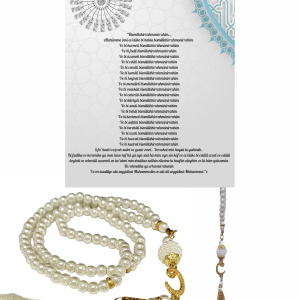 Namaz Tesbihi Vavlı 99'lu Cam İncili 35 Besmele-i Şerif Dua Kartı ile Krem Renk Hediyelik
