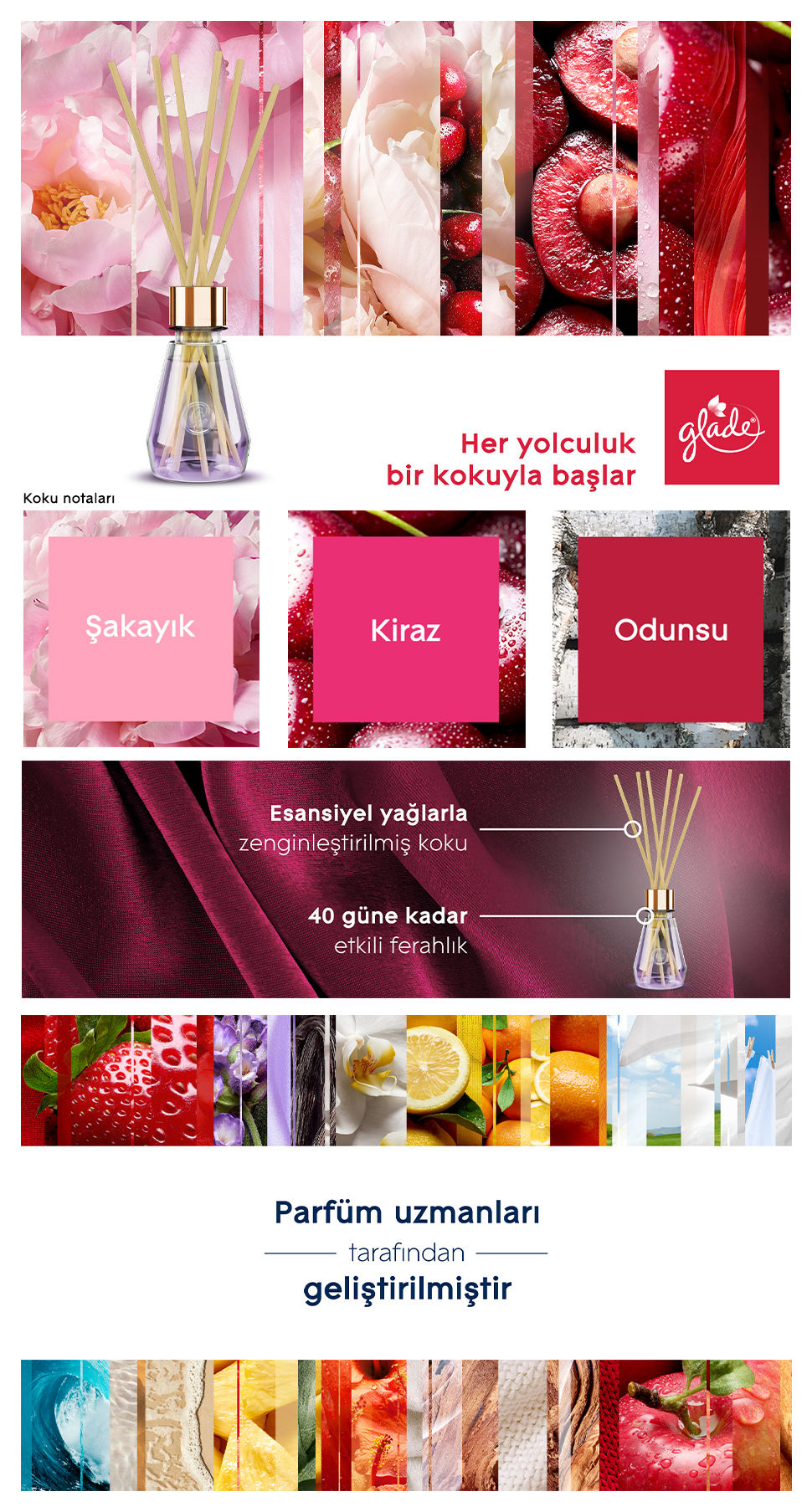 Evinizi bahar tazeliğiyle sarın!Glade Cherry Bloom, şakayık floral notaları, olgun kirakiraz meyvelerinin tatlı aromasıyla buluşur ve odunsu notaların sıcaklığıyla harmanlanmış özel bir koku sunar.; Şakayık, kiraz ve odunsu notaların uyumuyla hazırlanan bu özel koku, yaşam alanlarınıza 40 güne kadar etkili ferahlık sağlar.; Neden Tercih Etmelisiniz?🌸 Canlandırıcı Koku Profili: Şakayık, kiraz ve odunsu notaların dengeli birleşimiyle hem enerjik hem huzurlu bir ortam yaratır.; 🍒 Bahar Esintisi: Tatlı ve çiçeksi notalarla evinizde baharı yaşayın.; ✨ Dekoratif Tasarım: Modern tasarımı ve zarif şişesiyle dekorasyonunuza estetik bir dokunuş katar.; 🕒 Uzun Süreli Etki: 40 güne kadar etkili ferahlık.; 🌿 Kolay Kullanım: Çubukları yerleştirin, gerisini Glade yapsın!Kullanım Talimatı:Kapağı açın ve çıkarın, dekoratif bir dokunuş için altın rengi kapağı yerleştirin ve çubukları şişeye yerleştirin.; Çubukları ayırın.; Şişeyi dik ve düz bir yüzeyde tutun.; Dökülme durumunda yüzeyi Silin.; Ekstra koku yaymak için çubukları ters çevirin.