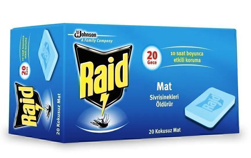 Raid Elektro Mat Sinek Kovucu Tablet elektrikli raid cihazlarla uyumludur ve gece boyunca sineklerin uzak kalmasını sağlar.
