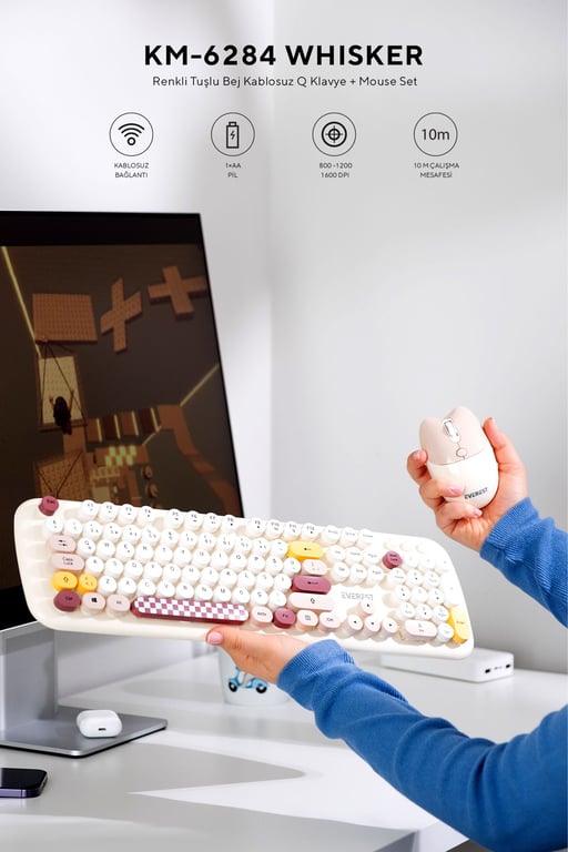 Everest KM-6284 WHISKER Renkli Tuşlu Bej Kablosuz Q Klavye + Mouse Set 8680096128646