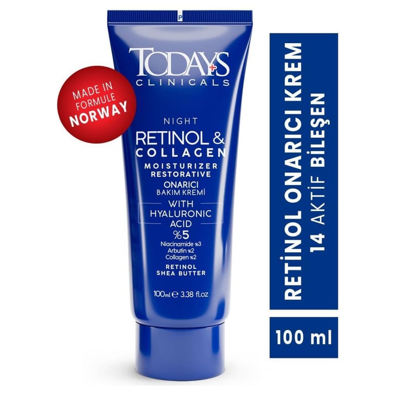 • YENİ CİLT BARİYERİ + YENİ NESİL ONARICI KREM + 14 AKTİF BİLEŞEN - Retinol Shea Butter Hyaluronic Acıd %5 collegen % 2 Arbutin % 2 * Günümüz Klinik Bakımı ile Norveç Dermatologların önerisi, TODAYS CLİNİCALS ONARICI BAKIM KREMİ Todays Clinicals Onarıcı Bakım kremi, zengin içeriği ile cilt kuruluğunun giderilmesine ve cildin onarılmasına yardımcı olmak için geliştirildi. İçeriğindeki Retinol Shea Butter yüksek vitamin ve yağ asitleri konsantrasyonu sayesinde cildi yatıştırma, yumuşatma ve nemlendirmeye yardımcı özelliklerinden faydalanmaktadır. İçeriğindeki hyaluronik asit sayesinde ciltteki elastikiyet kaybını önlemeye yardımcı olur. Hassas ciltlere uygundur. Renklendirici ve paraben içermez. Alkol içermez. Gözenekleri tıkamaz. * Made in Formula Norveç Kullanım Şekli : Tüm vücut ve her cilt tipi için kullanıma uygundur. Temiz ve nemli cildinize gece uygulayınız.