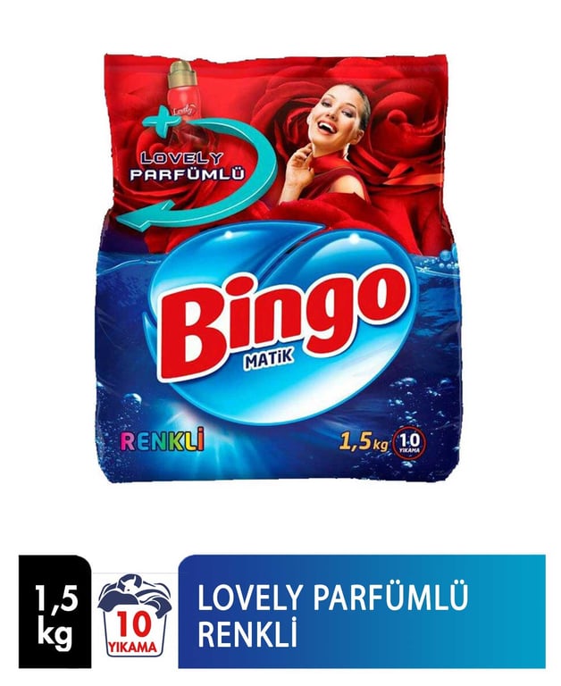 Bingo Matik Toz Çamaşır Deterjanı en zorlu lekeleri tek yıkamada çıkarır ve parfüm etkisiyle kıyafetlerinizin güzel kokmasını sağlar.
