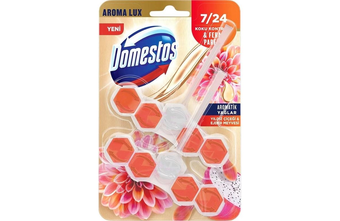 Domestos Aroma Lux Tuvalet Bloğu Yıldız Çiçeği & Ejder Meyvesi, içerdiği konsantre aromatik yağlar ile tuvaletinize bambaşka bir lüks deneyimi getiriyor.