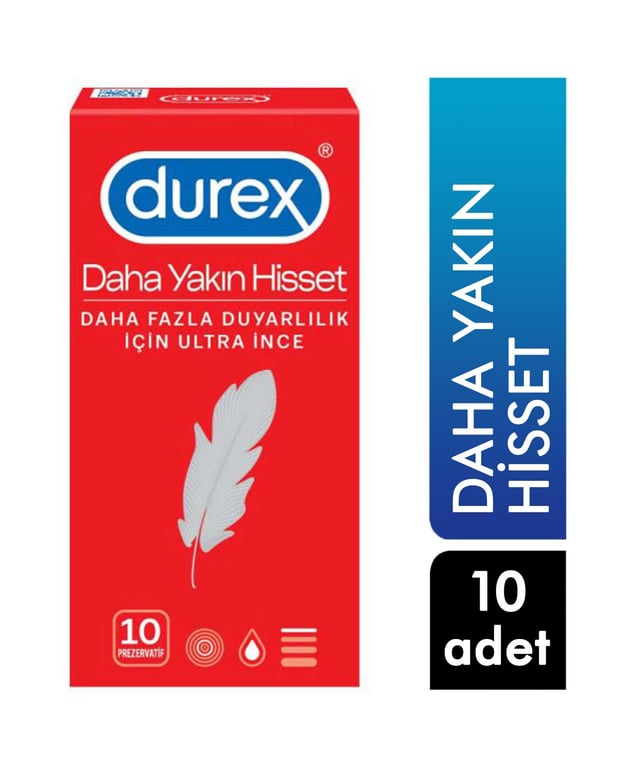 Daha fazla his için ultra ince üretilen Durex Daha Yakın Hisset Prezervatif kayganlaştırıcı krem içerir ve dayanıklı yapısıyla tam koruma sağlar.