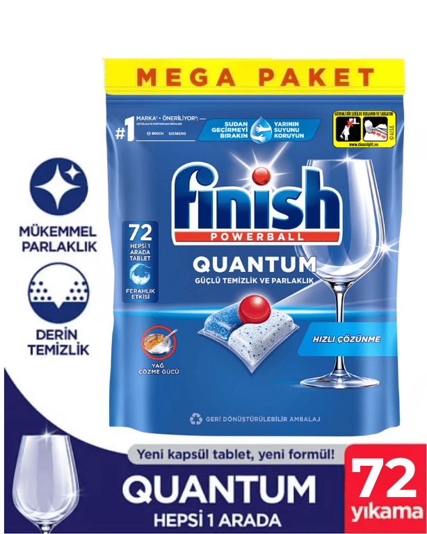 Finish Quantum Bulaşık Makinesi Tableti en zorlu kirleri ve yağları tek yıkamada söküp atarken powerball teknolojisi sayesinde bulaşıklarınızın parlamasını da sağlar.