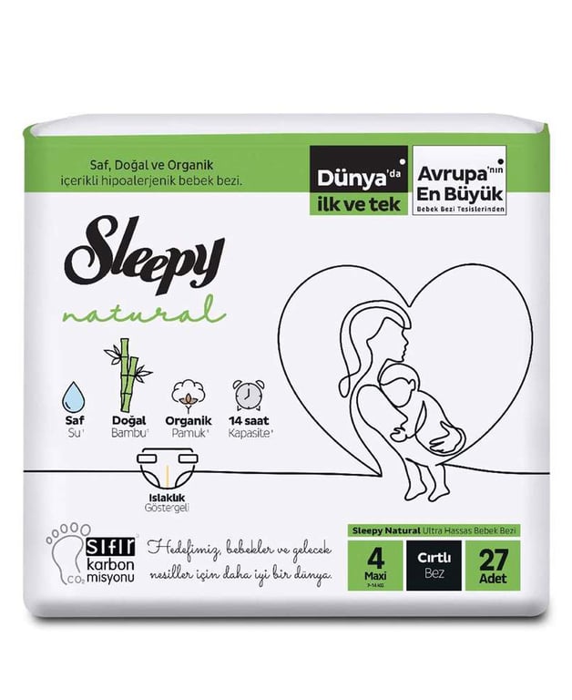 Sleepy Natural Bebek Bezi No:4 27'li Maxi, 7-14 kilogram arası bebekler için üretilmiş bir bebek bezidir. Doğal malzemelerden üretilen Sleepy Natural Bebek Bezi No:4 27'li Maxi, yumuşak ve nefes alabilen iç katmanı sayesinde bebeğinizin cildini kuru ve rahat tutar. Bezin yanlardan esneme özelliği sayesinde bebeğinizin hareketlerine uyum sağlar ve sızdırmazlığı sayesinde bebeğinizi rahat ettirir.
