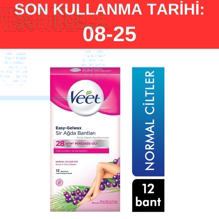 En kısa tüyleri bile kökünden alarak 28 güne kadar pürüzsüzlük sağlayan ve özel içeriği sayesinde kıl köklerini zayıflatarak zaman içerisinde tüy yoğunluğunun azalmasını sağlayan Veet ile istenmeyen tüylerden dilediğiniz an ve istediğiniz yerde kurtulabilirsiniz. Tüyleri kökünden alarak, 28 güne kadar pürüzsüzlük sağlar. Normal ve hassas ciltler için özel olarak geliştirilen ağda bantlarının yanı sıra tüy alımı sonrası tahriş veya kızarıklık yaşama riski taşıyan, alerjiye yatkın ciltler için hipoalerjenik formül ile geliştirilen Pure Sir Ağda Bantları ile tüylerinizden kolayca kurtulabilirsiniz. Normal ciltler için geliştirilen Veet Sir Ağda Bantlarının içeriğindeki Shea Yağı cildinizi nemlendirir ve Açai üzümü cildinizde güzel koku bırakır. Bacak ve vücut bölgelerinde kullanıma uygundur.
