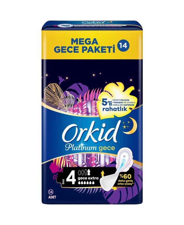 Orkid Platinum Gece Hijyenik Ped rahat bir gece geçirmeniz için geliştirildi. Orkid gece ekstranın yumuşak ve emici dokusu ile yan bariyerleri, gece sızıntıyı engellemek ve sizi rahat ettirmek için özel olarak tasarlanmıştır. 3 boyutlu sızıntı kalkanı, 1000 yumuşak mikro yastığı, yumuşak ve uyumlu tasarımı ve kokuları hapsetme teknolojisi sayesinde 5 kat rahatlık sunar.