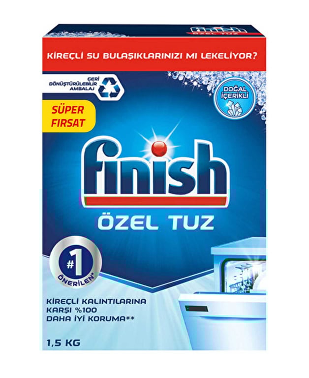 Finish Bulaşık Makinesi Tuzu ile daha temiz bulaşıklara ve daha iyi temizleyen bir makinaya kavuşun. Bulaşık makinenizi koruyan, kullanım ömrünü ve temizleme gücünü artırır. Kirecin etkisini azaltarak hem bulaşıklardaki kireç lekelerini önler hem de makinenizin kireçten korunmasına yardımcı olur.