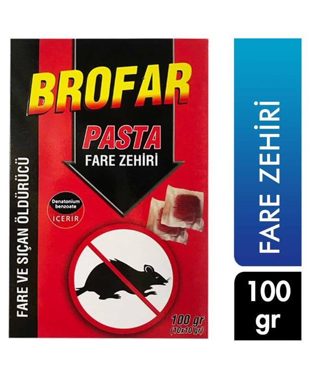 Hastalık yayan ve tehlikeli haşereden kurtulmanızı sağlayan Brofar Pasta Fare Zehiri denatonium benzoate içerir ve dikkatli kullanılması gereken çok zehirli bir yemdir.