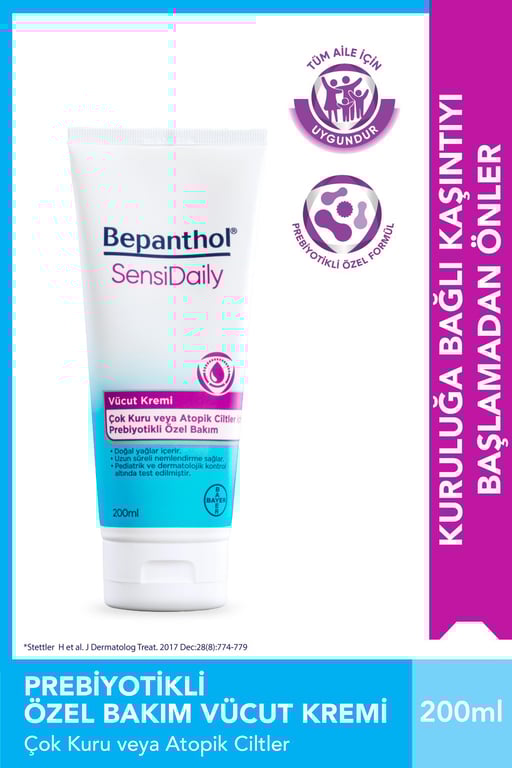 “Bepanthol® SensiDaily Vücut Kremi çok kuru veya atopik ciltler için geliştirilmiş, bebeklikten itibaren kullanılabilen, prebiyotikli bir günlük vücut kremidir. Düzenli kullanımda, prebiyotikli formülü ile cildin doğal koruyucusu olan mikroflorayı destekler. Tekrarlayan yoğun kuruluğu ve kaşıntıyı başlamadan önler. B3 vitamini, Provitamin B5, Sheabutter, Seabuckthorn Yağı, Seramid 3, Gliserin ve Zeytinyağı ile zenginleştirilmiş formülü sayesinde uzun süreli bir nemlendirme sağlar. Bebeklerde ve çocuklarda kullanımı güvenlidir. Günlük kullanıma uygundur. Koruyucu, parfüm,  paraben, renklendirici ve SLS içermez.”