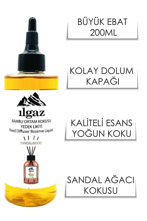 Sandal Wood Bambu Yedek Likit 200 ml Bambu Oda Kokusu Yedek Şişe Sandal Çubuklu Oda Kokusu Kolay Kullanım ; ; ; Doğal kokulardan oluşan bambu çubuklu oda kokusu serimizden Sandal Bambu Çubuklu Oda Kokusu Sandal ağacının özleri ile elde edilmiştir. ; ; Ortama yaydığı mistik, çekici ve dinlendirici etkisi ile huzur verici bir kokuyu ortamlarınıza sunuyoruz. ; ; Dekoratif Bambu Çubuklu Oda Parfümünüzü tazelemenize yardımcı olacak, olağanüstü notaların bir araya gelmesiyle tüm mekanlarınıza ferahlık ve huzur vermek için tasarlandı. ; ; Ferahlatıcı ve rahatlatıcı aromaları ile Ilgaz Oda Kokuları evlerinizde yerini almaya devam ediyor. ; ; Kalitesi ve yoğunluğu ile kötü kokuları yok eder. ; ; Kalıcı ferahlık sağlar. ; ; Tüm zevklerine hitap eden Ilgaz oda kokuları ile ferahlığın ihtişamını yaşayın. ; ; Kolay kullanım kapağı sayesinde bambu çubuklu oda kokunuz bittiğinde kolaylıkla odanızın kokusunu tazeleyebileceksiniz. ; ; ; ; ; Kullanım Önerisi: Şişenin içerisine daha önce farklı bir ürün olmamasına dikkat ederek ürün içerisinden bambu çubukları çıkarınız. ; ; Ilgaz bambu oda kokusu yedek likitinizin kapağını döndürerek açtıktan sonra şişeyi ters çevirerek cam bambu şişenize daldırınız. ; ; Hafifçe sıkarak dolumunu yapınız. ; ; ;