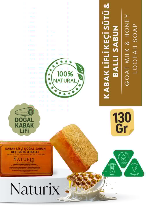 Doğal Kabak Lifli Keçi Sütü & Ballı Sabun ile Cildinizi Canlandırın! Naturix Kabak Lifli Keçi Sütü & Ballı Sabun, doğanın sunduğu en saf bileşenlerle hazırlanmış, cildinize derinlemesine bakım sağlayan etkili bir doğal sabundur. Akneye eğilimli ciltler için özel olarak tasarlanmış bu sabun, peeling etkisiyle cildinizi arındırır ve ferahlatır. Kabak lifleri, ölü derileri nazikçe temizlerken, keçi sütü cildinizi nemlendirir ve yumuşatır. Ballı formülü ise doğal bir antiseptik özellik göstererek, kurutucu etki sağlar.