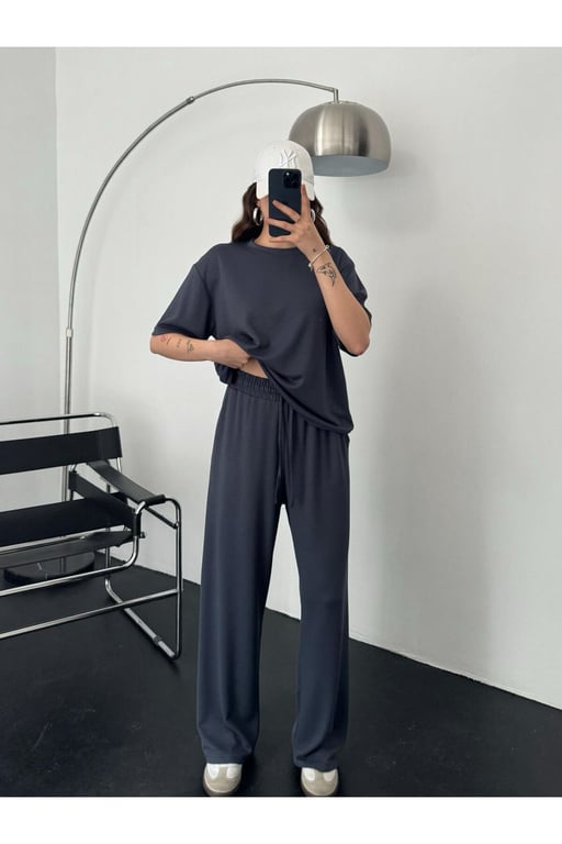 Thiff Antrasit Kadın Modal Kumaş Kısa Kolu Eşofman Takımı 202303061044