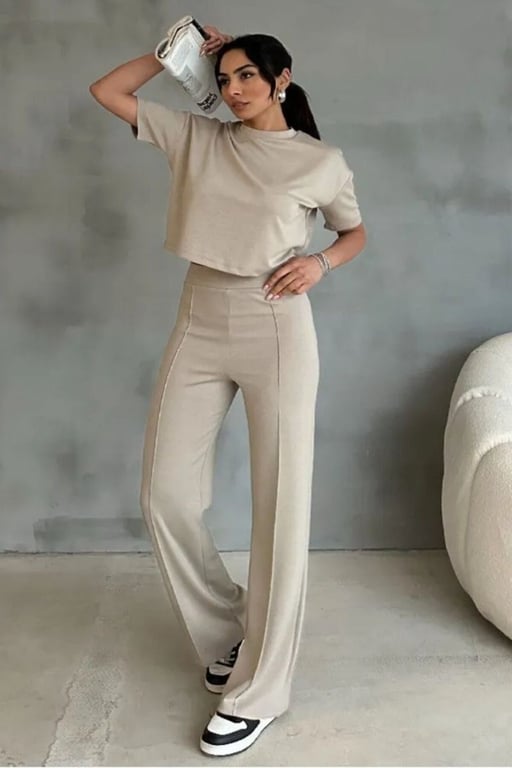 Thiff Bej Modal Kumaş Yüksek Bel Pantolon Crop & Pantolon Takım 202303070044