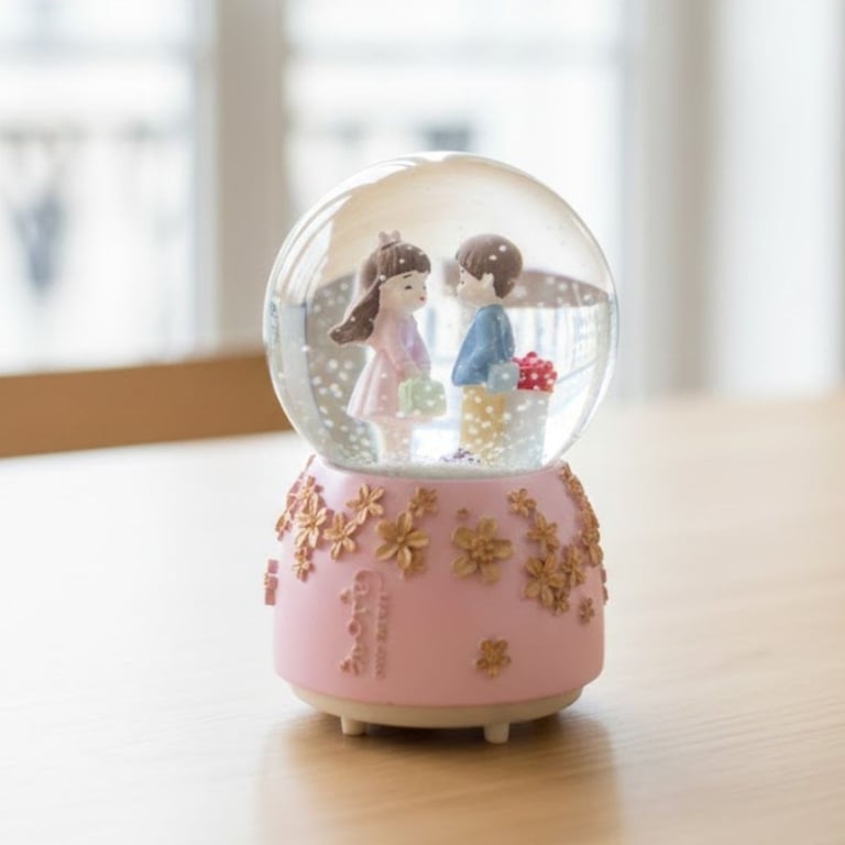 Cam fanus içinde yer alan sevgili temalı figür, sallandığında nazikçe süzülen kar efektleriyle büyüleyici bir görsel şölen oluşturur. LED aydınlatma sistemi sayesinde kar küresi karanlık ortamlarda da göz alıcı bir ambiyans yaratırken, müzik özelliği romantik atmosferi tamamlar.