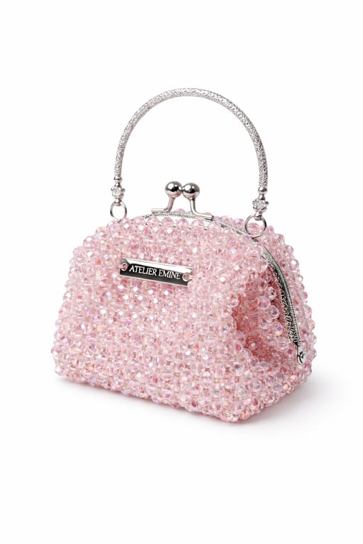 Atelier Emine’in Crystal Gelato Couture koleksiyonuna ait Affogato Fragola, 8 mm optik sınıfı kristal boncukların yüksek dayanımlı misina ile tek tek örülmesiyle üretilmiş, metal çerçeve yapıya sahip premium mini çanta modelidir.