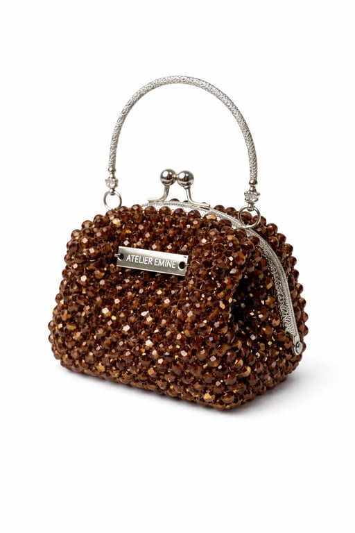 Atelier Emine’in Crystal Gelato Couture koleksiyonuna ait Affogato Mocha, 8 mm optik sınıfı kristal boncukların yüksek dayanımlı misina ile tek tek örülmesiyle üretilmiş, metal çerçeve yapıya sahip premium mini çanta modelidir.
