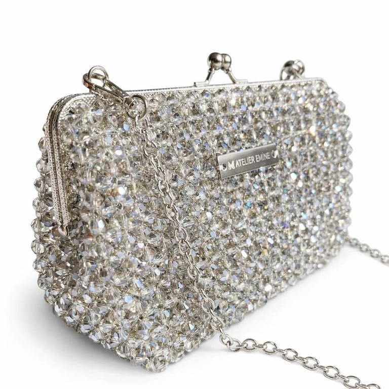 Atelier Emine’in Crystal Gelato Couture serisine ait bu tasarım; 8 mm optik sınıfı kristal boncuklar kullanılarak, tamamı el işçiliğiyle üretilmiş çerçeveli kapama sistemine sahip premium clutch çanta modelidir.