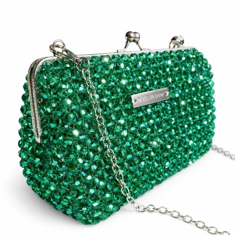 Atelier Emine’in Crystal Gelato Couture serisine ait bu tasarım; 8 mm optik sınıfı kristal boncuklar kullanılarak, tamamı el işçiliğiyle üretilmiş çerçeveli kapama sistemine sahip premium clutch çanta modelidir.