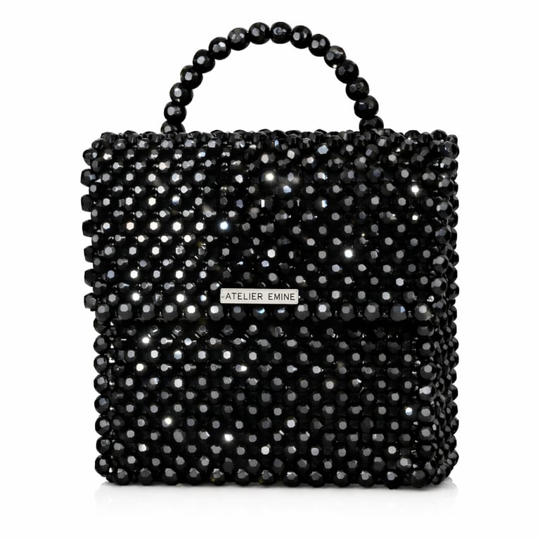 Çanta gövdesi, 8 mm standart yuvarlak kesim optik sınıfı kristal boncukların, yüksek dayanımlı monofilament misina kullanılarak yüksek yoğunluklu düz örgü tekniğiyle tek tek işlenmesi sonucu tamamen el işçiliğiyle oluşturulmuştur. Kristallerin sık ve homojen dizilimi, yüzey boyunca kesintisiz bir parlaklık sağlarken; örgü yapısı çantanın desteksiz şekilde formunu koruyabilen rijit bir yapı kazanmasını mümkün kılar.