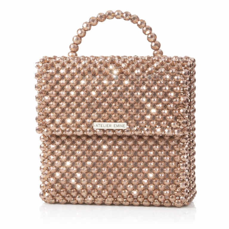 Çanta gövdesi, 8 mm standart yuvarlak kesim optik sınıfı kristal boncukların, yüksek dayanımlı monofilament misina kullanılarak yüksek yoğunluklu düz örgü tekniğiyle tek tek işlenmesi sonucu tamamen el işçiliğiyle oluşturulmuştur. Kristallerin sık ve homojen dizilimi, yüzey boyunca kesintisiz bir parlaklık sağlarken; örgü yapısı çantanın desteksiz şekilde formunu koruyabilen rijit bir yapı kazanmasını mümkün kılar.