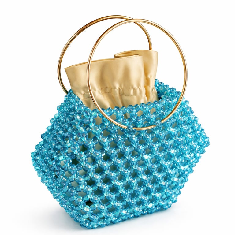 Kristal boncuklar, yüksek dayanımlı misina ile tek tek örülerek çok katmanlı bir yüzey yapısı oluşturur. Bu yapı, çantanın form bütünlüğünü korurken kristal örgünün üç boyutlu etkisini güçlendirir ve yapısal stabilite sağlar.