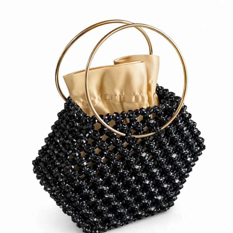 Kristal boncuklar, yüksek dayanımlı misina ile tek tek örülerek çok katmanlı bir yüzey yapısı oluşturur. Bu yapı, çantanın form bütünlüğünü korurken kristal örgünün üç boyutlu etkisini güçlendirir ve yapısal stabilite sağlar.
