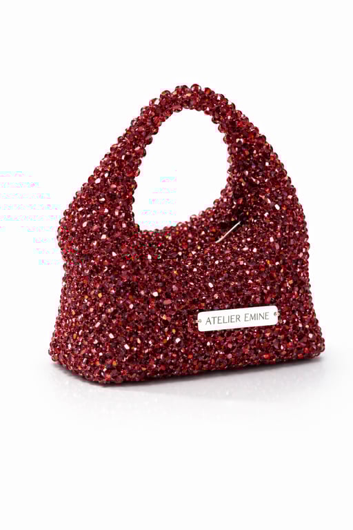 Atelier Emine’in Crystal Gelato Couture koleksiyonuna ait Budino Amarena, 8 mm optik sınıfı kristal boncukların yüksek dayanımlı misina ile tek tek örülmesiyle tamamen el işçiliğiyle üretilmiş, yumuşak geçişli heykelsi formda premium mini çanta modelidir.