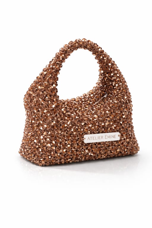 Atelier Emine’in Crystal Gelato Couture koleksiyonuna ait Budino Cacao, 8 mm optik sınıfı kristal boncukların yüksek dayanımlı misina ile tek tek örülmesiyle tamamen el işçiliğiyle üretilmiş, yumuşak geçişli heykelsi formda premium mini çanta modelidir.