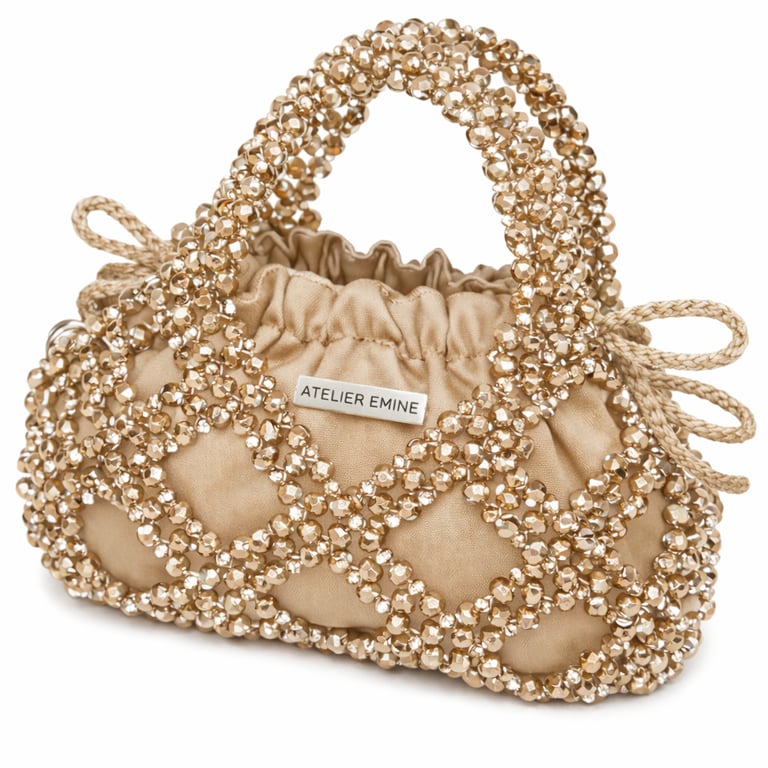 Budino Creta, Atelier Emine’in Crystal Gelato Couture koleksiyonunda yer alan; tek parça couture yaklaşımıyla ele alınmış, tekstil ve kristal işçiliğinin heykelsi bir birliktelik sunduğu top-handle pouch bag tasarımıdır.
